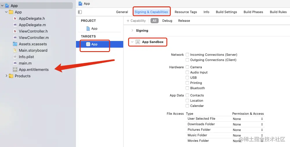 打开后若工程如下,则不需改动。若在”Signing & Capabilities“ 中没有App Sandbox,自己点击”+“添加一个即可。