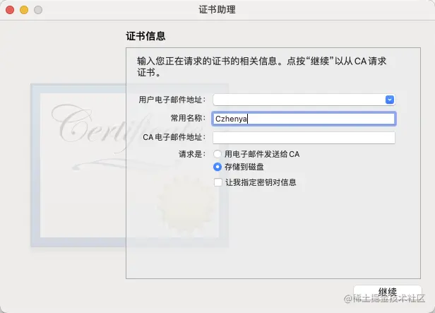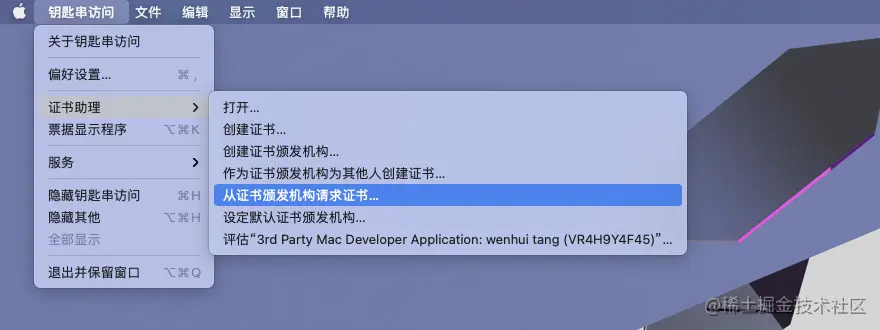 打开应用KeyChain(钥匙串),点击菜单栏“钥匙串访问” - “证书助理” - “从证书颁发机构请求证书”: