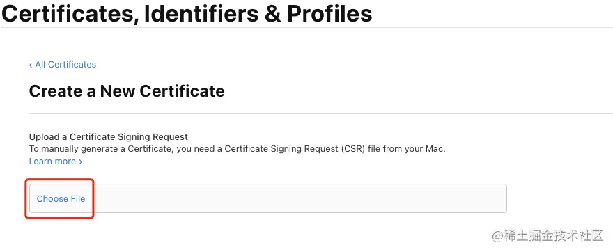 Choose File选3.1步骤中生成的CSR文件,然后点击右上角Continue继续按钮: -