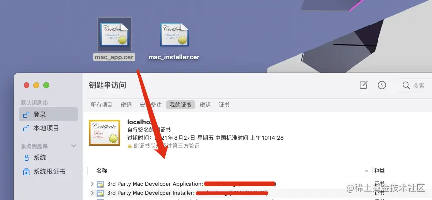 最后一步,分别双击下载好的证书,将其添加到钥匙串中:(话红线的部分是名称后面要用)