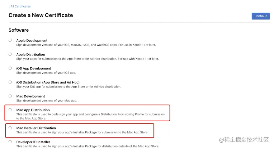 Mac App DistributionMac应用程序分发 和Mac Installer DistributionMac安装程序分发,选择其中一个,点击右上角Continue继续按钮: