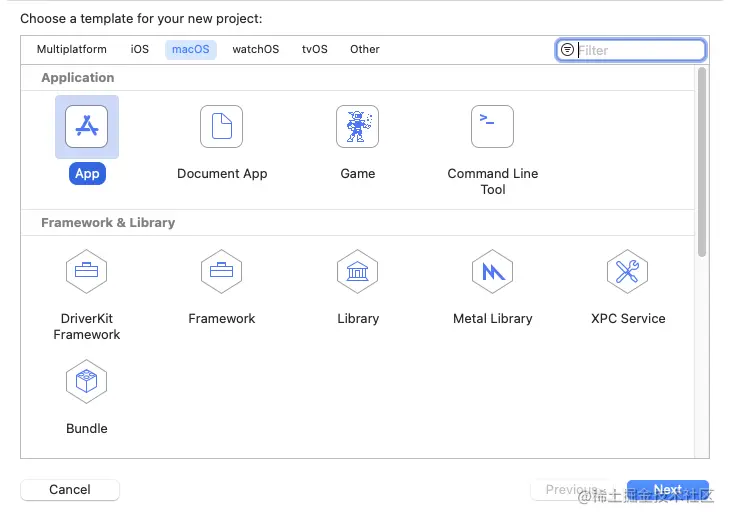 打开xCode,菜单栏选择”File“ --> "New" --> "Projecr" --> 弹出窗后选择”macOS“ —> "App",然后选择”Next“下一步后,随便命名即可(我这里起名为App)