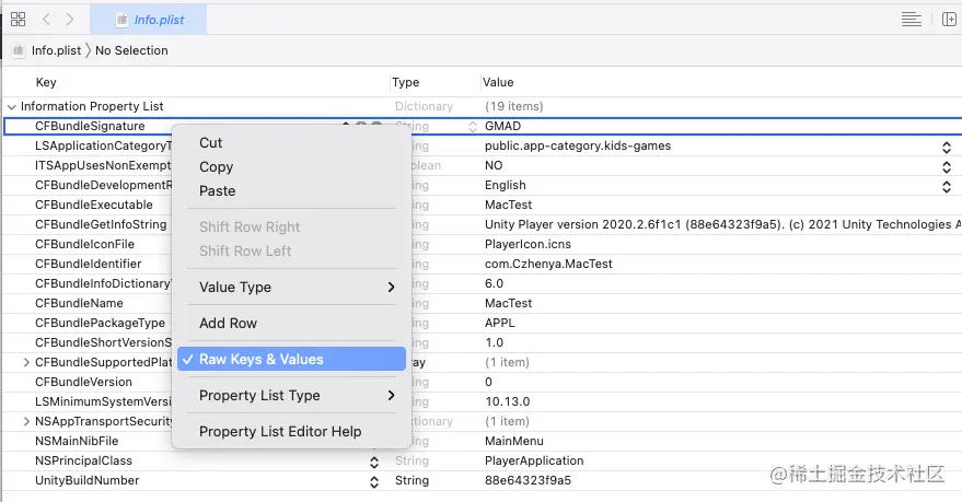 若你的plist和我的显示不一样,选中任意属性右键选”Raw Keys & Values“进切换即可显示一致: