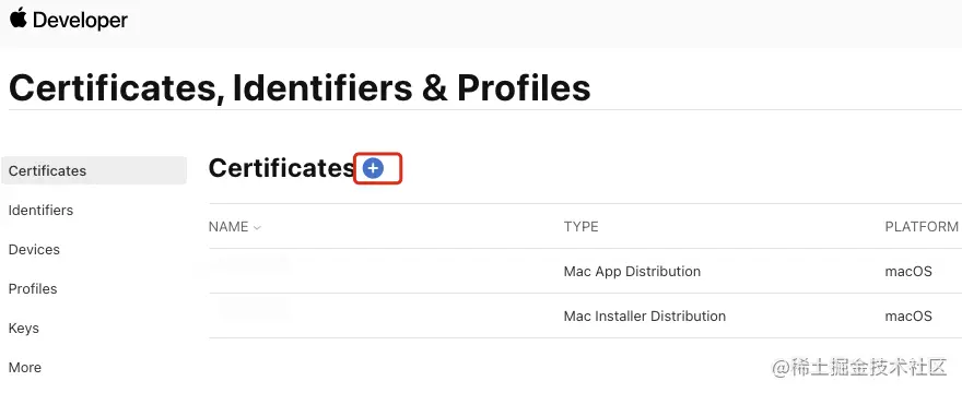 点击开后会看到已经创建的证书,有则直接点击进去下载即可,若没有则点击“+” 新建证书: