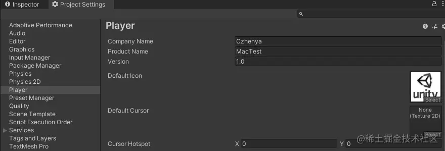 打开 Project Settings (Edit -> Project Settings -> Player) 面板,配置包名,版本号,Icon等基础打包设置: