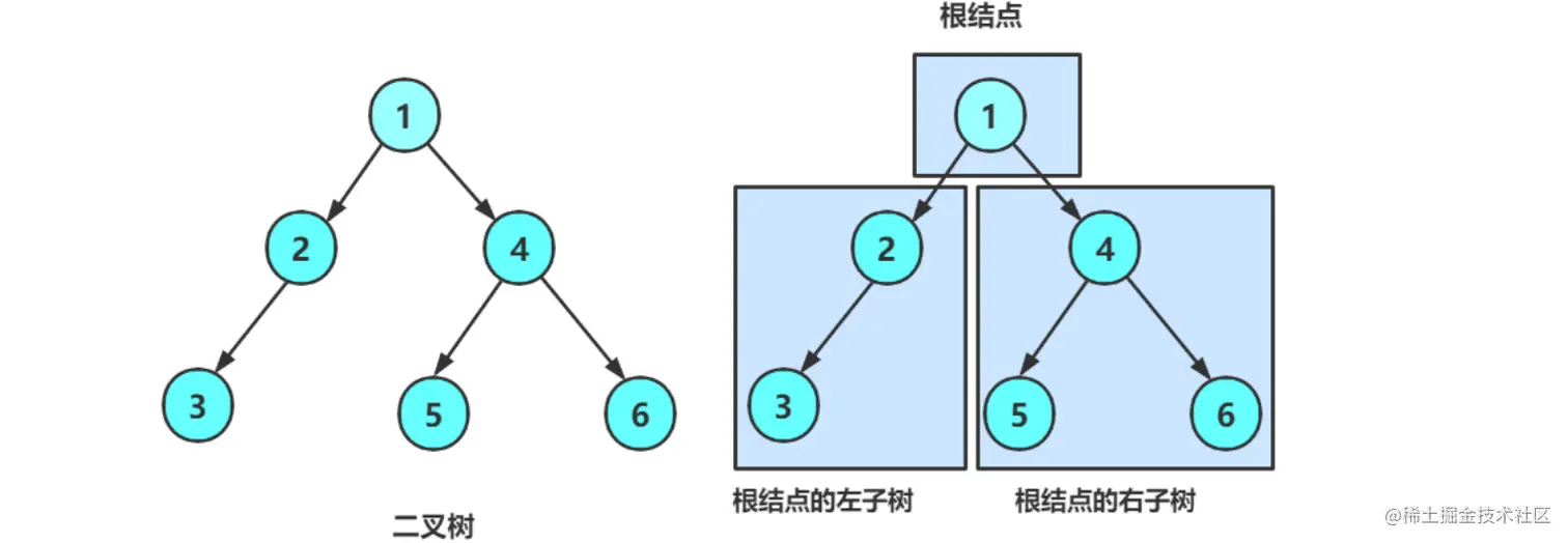 二叉树由一个根节点加上左子树和右子树组成: