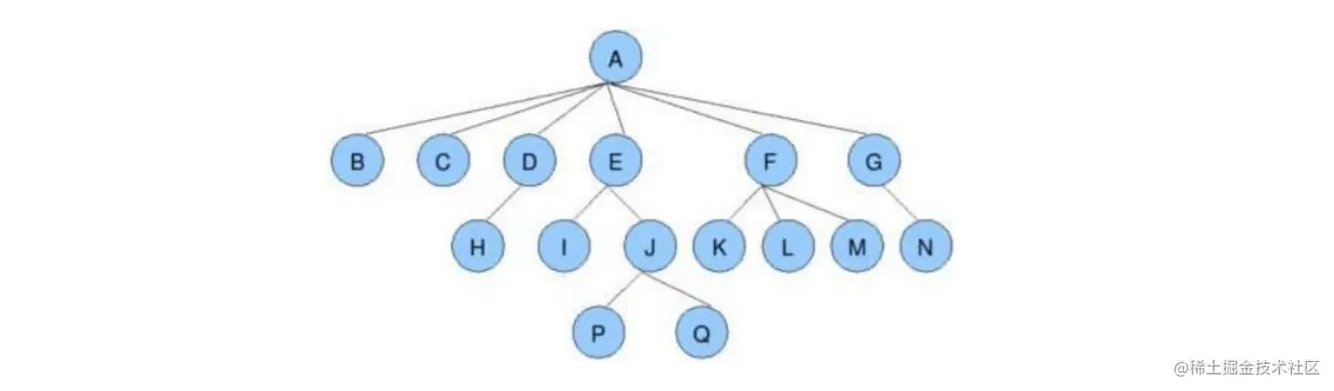 | 叶节点或分支节点 | 度为0的节点称为叶节点,反之为分支节点 | 如上图:B、C、H、I、P、Q等节点为叶节点,其它的为分支节点 |