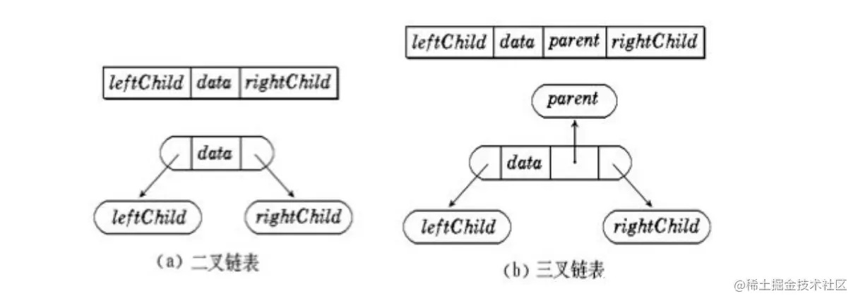 通常的方法是链表中每个结点由三个域组成,数据域和左右指针域,左右指针分别用来给出该结点左孩子和右孩子所在的链结点的存储地址