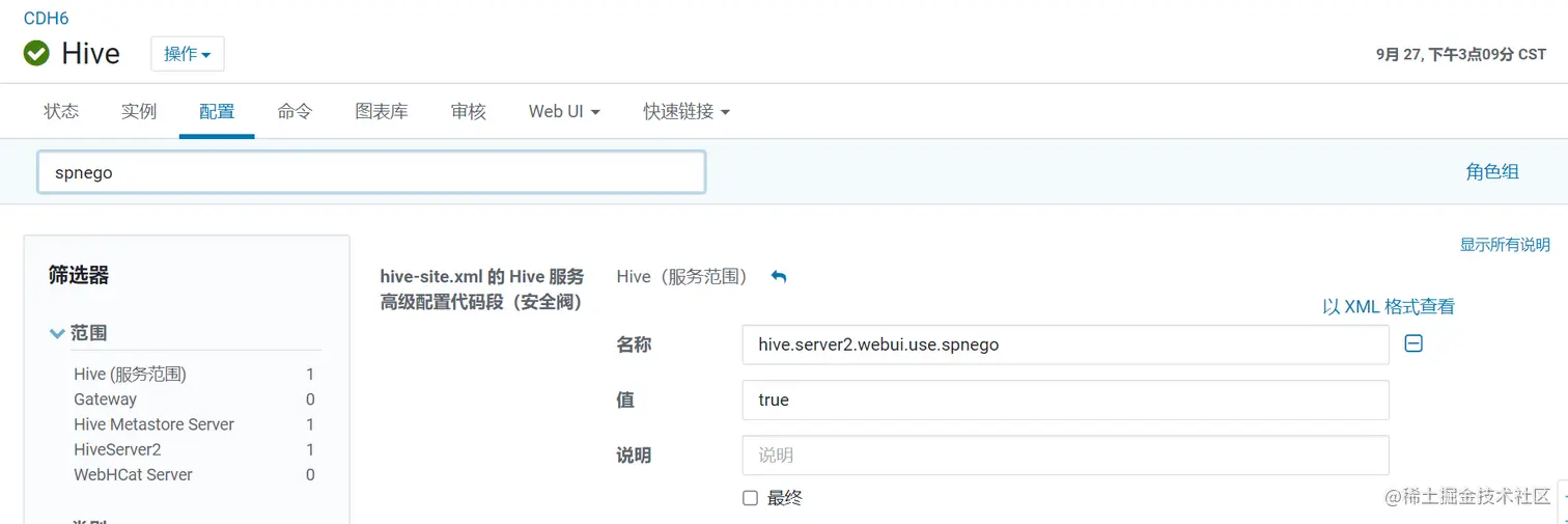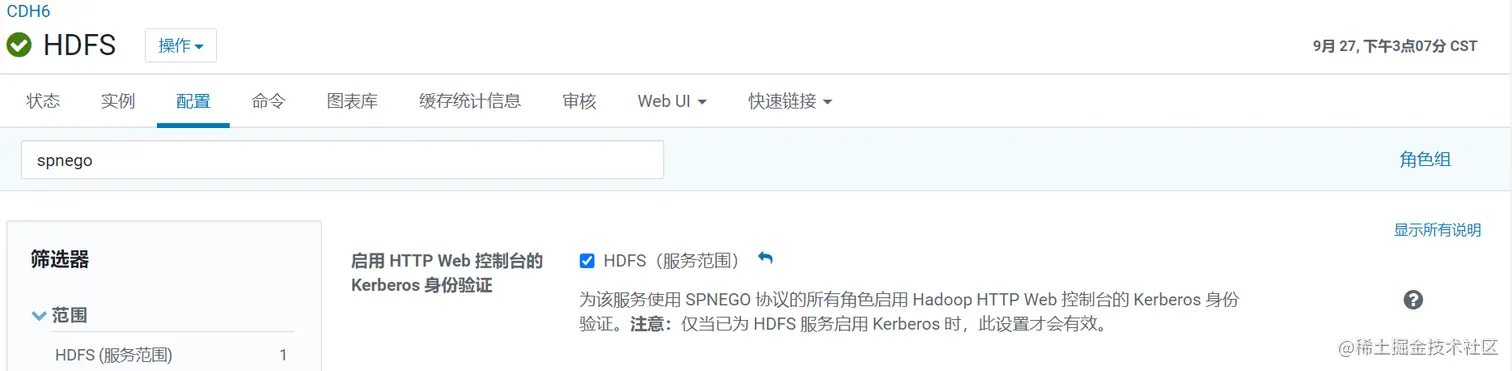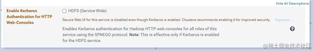 查看服务端配置,发现服务开启了 "Enable Kerberos Authentication for HTTP Web-Consoles", 截图如下: