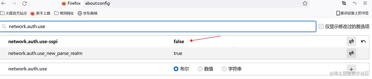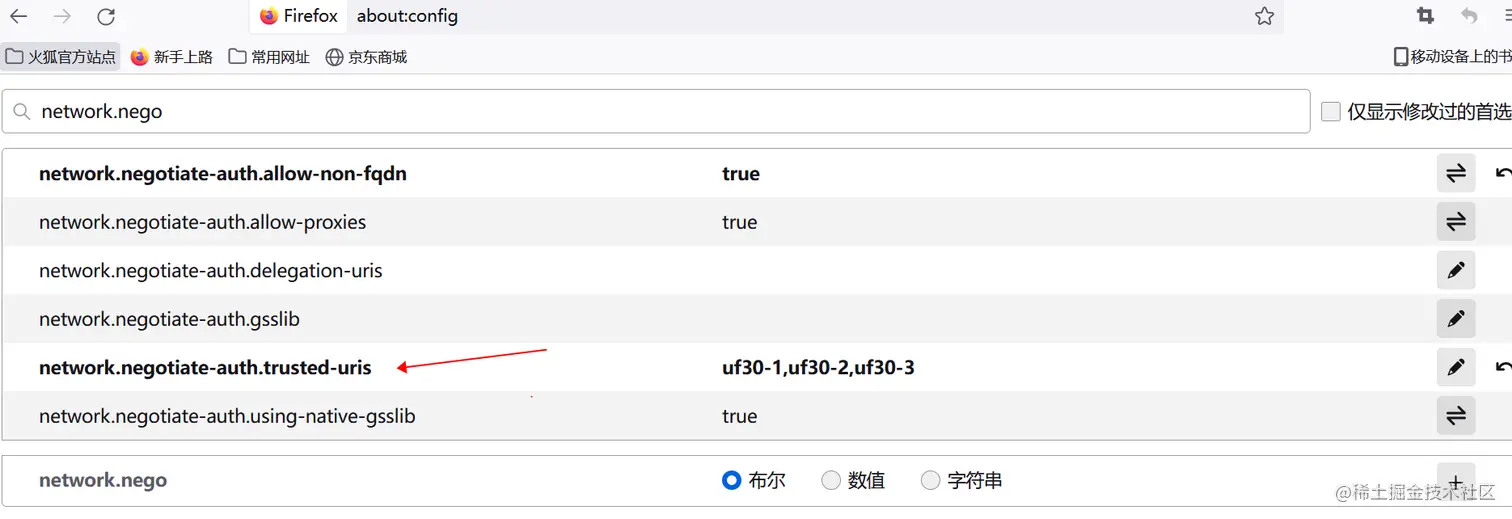 由于chrome浏览器中 kerberos 相关配置比较复杂,建议配置使用firefox浏览器。 打开firefox浏览器,在地址栏输入about:config,然后搜索并配置如下两个参数: network.auth.use-sspi:将值改为false; network.negotiate-auth.trusted-uris:将值为集群节点ip或主机名;
