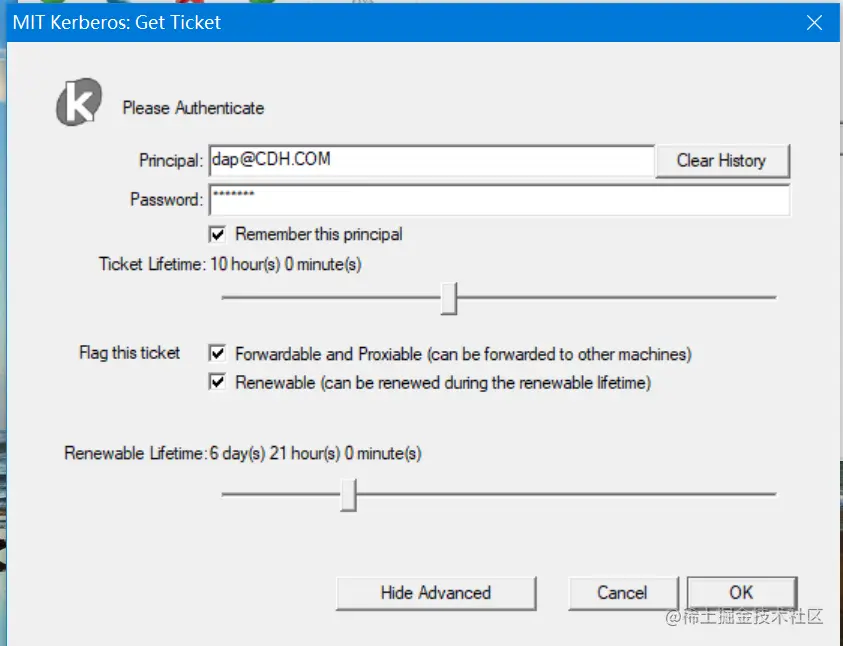 可以在kerberos windows客户端中通过用户名密码获取获取kerberos ticket,也可以在命令行通过kinit命令获取kerberos ticket。获取到 kerberos ticket后,通过firefox浏览器就可以正常开启spnego认证的hdfs/yarn/hivewebui了: