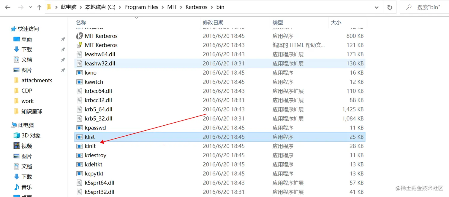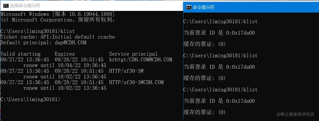调整PATH环境变量前后,命令行klist命令的输出结果不同,如下所示: