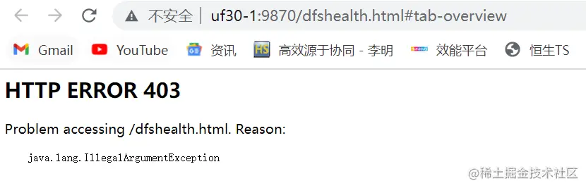 在CDH/CDP等大数据平台中,当开启kerberos安全后,一些常见服务如 HDFS/YARN/HIVESERVER2 的webui, 无法访问,通过chrome浏览器访问时,报错 HTTP ERROR 403,Problem accessing xxx. Reason: java.lang.IllegalArgumentException。截图如下: