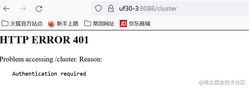 通过查看后台日志,也能确认是用户认证问题;同时在客户端浏览器没有获取到有效的kerberos ticket 时,通过firefox浏览器访问目标链接,其报错提示信息更加明确地指出了需要认证: