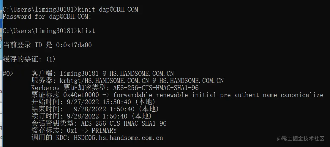 将Kerberos KDC服务端的配置文件/etc/krb5.conf中的内容拷贝到windows上kerberos客户端文件 krb5.ini 中,该文件路径如下:C:\ProgramData\MIT\Kerberos5\krb5.ini