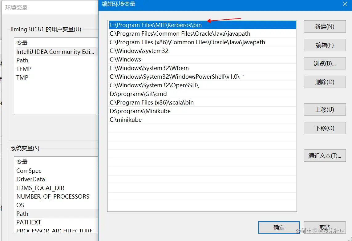 由于Kerberos客户端和OracleJDK都包含 kerberos 的 klist/kinit等命令工具,为确保后续命令行使用的是Kerberos客户端的klist/kinit,需要配置PATH环境变量将 Kerberos 目录调整靠前,如下图所示: