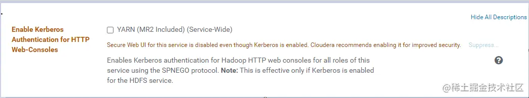 可以关掉 Enable Kerberos Authentication for HTTP Web-Consoles (Secure Web UI for this service is disabled even though Kerberos is enabled.), 如下图所示:(hdfs/yarn都有该选项;hive 需要通过配置高级参数 hive.server2.webui.use.spnego 实现))