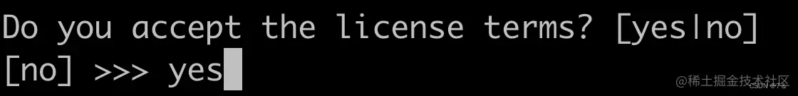 回车后查看许可证,按enter键逐行查看,按空格键逐页查看,按 q 退出查看许可证,然后输入 yes 表示同意