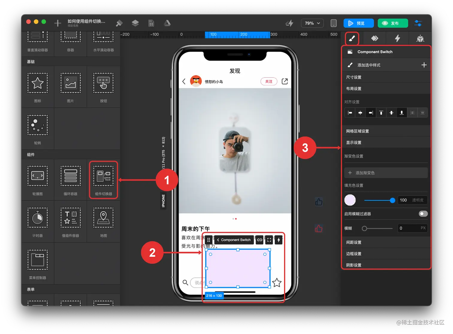 这样就可以使用组件切换器来完成组件切换类的交互体验了。