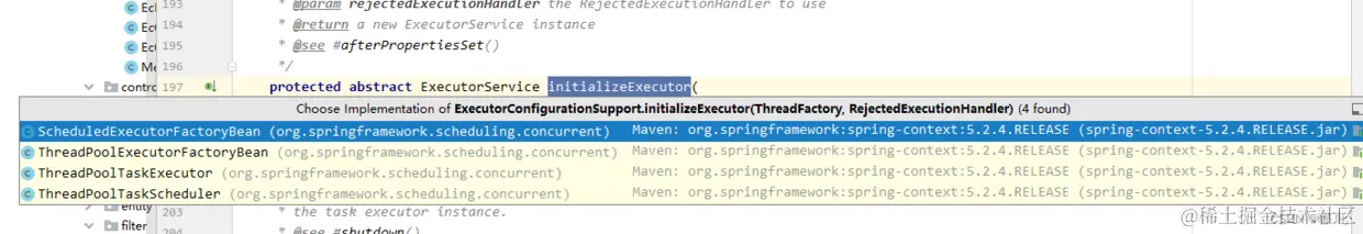 再查看一下initializeExecutor抽象方法的具体实现类,其中有一个就是ThreadPoolTaskExecutor类,查看它的initializeExecutor方法,使用的就是ThreadPoolExecutor。
