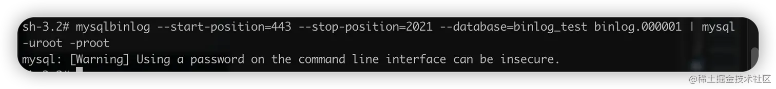 mysqlbinlog --start-position=443 --stop-position=2021 --database=binlog_test binlog.000001 | mysql -uroot -proot
