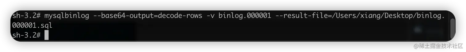 mysqlbinlog --base64-output=decode-rows -v binlog.000001 --result-file=/Users/xiang/Desktop/binlog.000001.sql