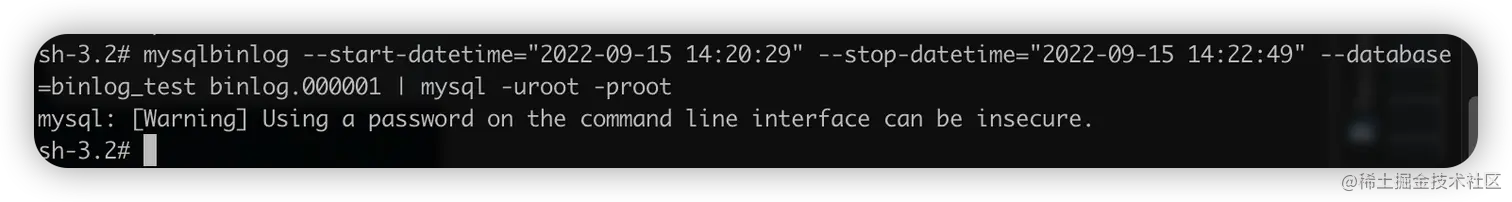 mysqlbinlog --start-datetime="2022-09-15 14:20:29" --stop-datetime="2022-09-15 14:22:49" --database=binlog_test binlog.000001 | mysql -uroot -proot