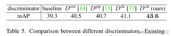 表5中,使用传统的像素级鉴别器仅获得了 39.3% 的 mAP 得分。