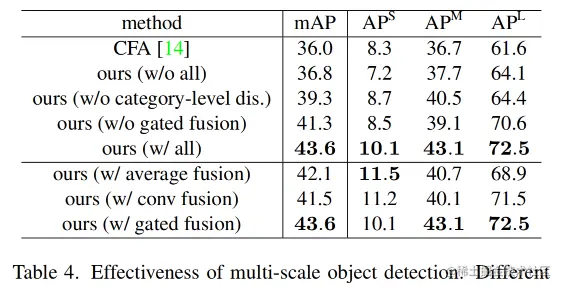 表4中,与 baseline 方法相比,在目标检测网络中使用全尺度门控融合,显著提高了所有尺度的性能。