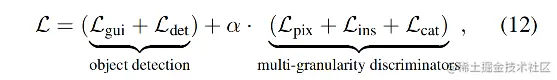 全尺度门控目标检测网络由 Lgui 和 Ldet 来进行监督,同时对多粒度鉴别器进行了不同粒度的优化,包括像素级、实例级和类别级,总之,整体损失函数定义为公式(12),其中 α 是目标检测和多粒度鉴别器之间的平衡因子。