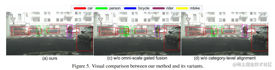 如图5所示,所提出的全尺度门控融合和类别级鉴别器降低了自适应域中目标检测的误报。