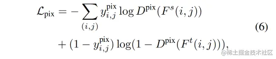 Pixel-level and instance-level discriminators 像素级 和 实例级鉴别器分别用于执行特征映射像素级和实例级对齐。如图3所示,给定输入的多级特征F 和 合并特征M,类似于以前的工作,使用相同的损失函数,例如,像素级鉴别器的损失函数定义为公式(6)。