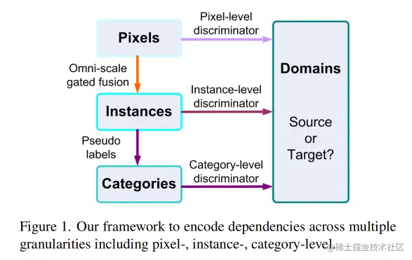 为了解决上述问题,作者提出了一个统一的基于多粒度对齐的无监督域自适应目标检测框架。如图1所示,在像素、实例和类别等不同粒度的角度对依赖项进行编码,以对齐源域和目标域,这并不是以前的单粒度对齐技术的粗略组合。