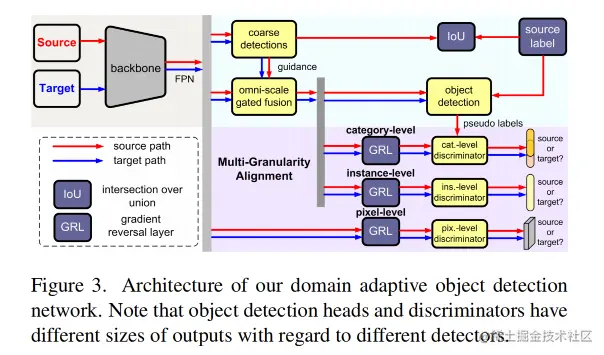 如图3所示,给定来自源域s 和 目标域t 的图像,首先使用 backbone 计算基本特征映射,然后通过全尺度门控融合模块对像素级特征进行融合,生成多尺度实例的判别表示。在融合特征的基础上,目标检测能够更加准确地识别出目标。同时引入了多粒度判别器,从像素级、实例级和类别级等不同角度来区分源域和目标域之间的特征分布。
