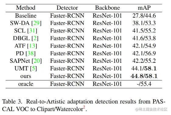 表3中使用 Faster-RCNN 和 ResNet-101 在从 PASCAL VOC 到 Clipart 和 Watercolor 的 real-to-artistic 适应数据集上评估了论文的方法。