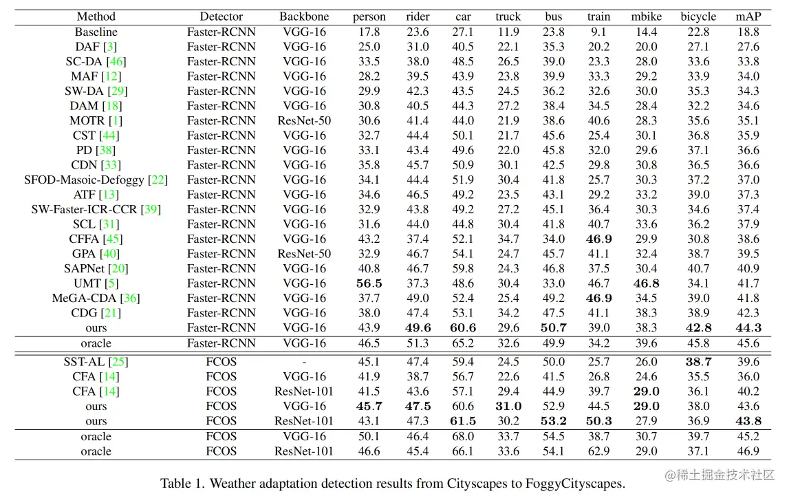 表1中,在 Cityscapes 到 FoggyCityscapes 天气适应数据集上评估了提出的方法。