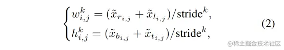 对于特征映射中的每个像素 (i, j),对应的 box 可以定义为一个4维向量,分别表示当前位置与 ground truth box 的上、下、左、右边界之间的距离。因此,可以将每个级别的归一化目标比例用公式(2) 进行计算。