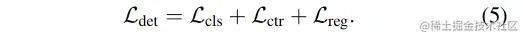 Object detection 在获得合并的特征映射 M 后,开始预测目标的类别和 bounding boxes。在 FCOS 网络中,目标检测头由分类、中心度和回归分支组成。分类和中心度分支通过 focal loss 和 交叉熵损失来进行优化,而回归分支采用 IoU损失来进行优化。总的损失函数定义为 公式(5)。