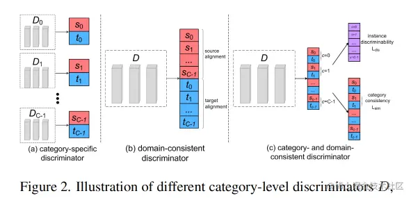 Category-level discriminator 如图2(c) 所示,作者的类别级鉴别器用于保持不同域分布之间的语义一致性。