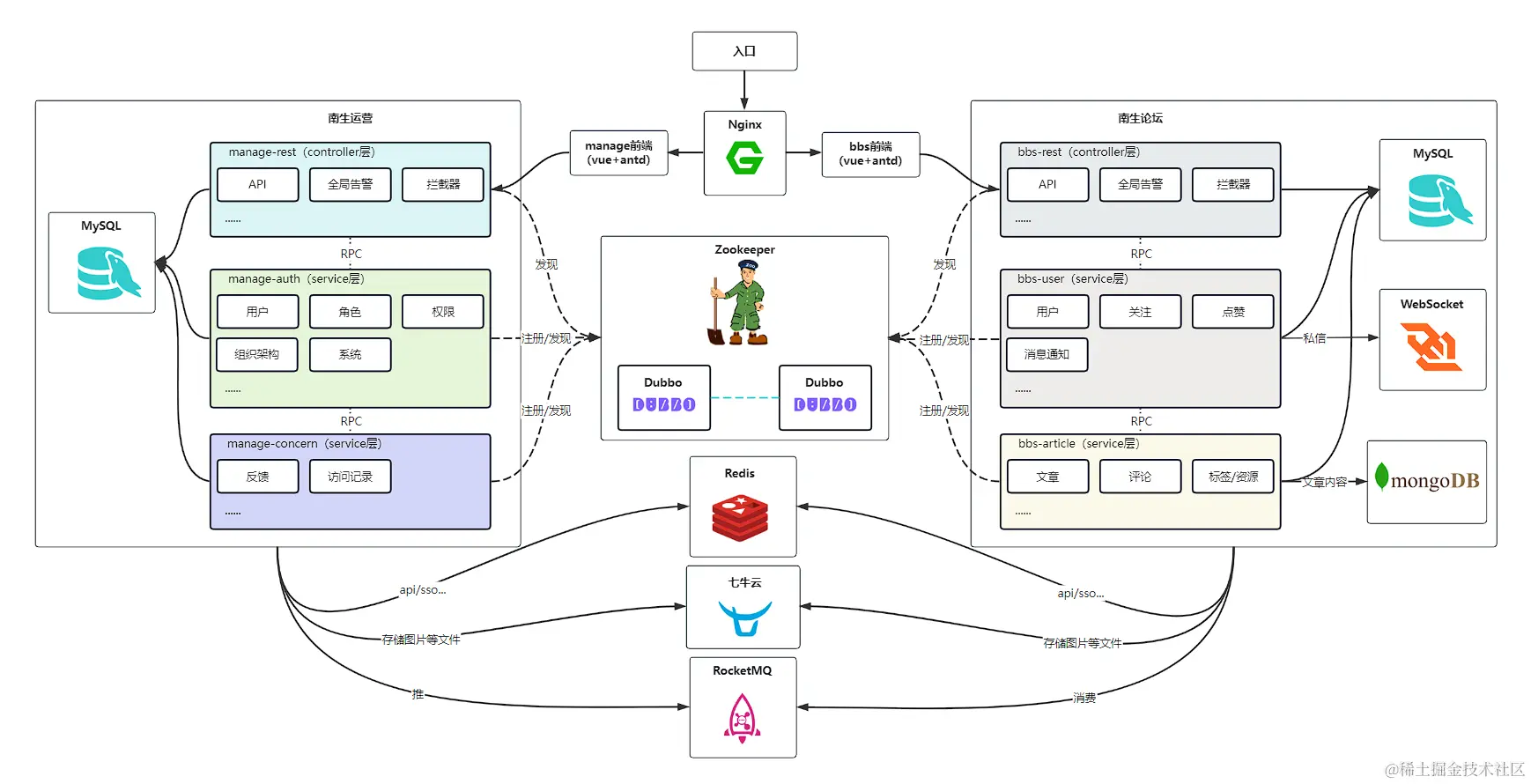 - 后端: SpringBoot、Dubbo、Zookeeper、RocketMQ、Redis、MyBatis、MySQL、MongoDB、WebSocket、Shiro、七牛云(图片/视频全部存于此)、...
