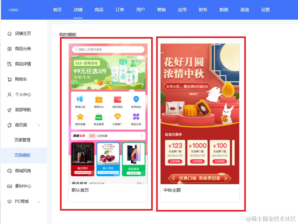 页面模板有两种,一种是默认首页,一种是中秋主题,商家可以先选择模板再在模板中进行修改设计,如下图所示: