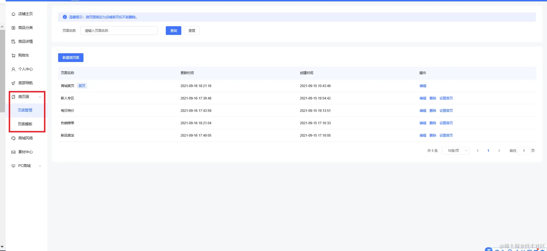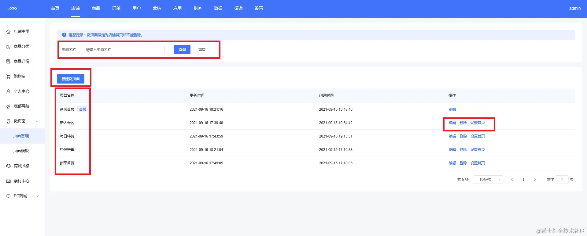 微页面有页面管理和页面模板,页面管理是管理所有的商城页面,可以新建也可以编辑、删除、设置成首页等操作,还可以输入页面名称进行查询,注意,微页面指定为店铺首页后不能删除,如下图所示: