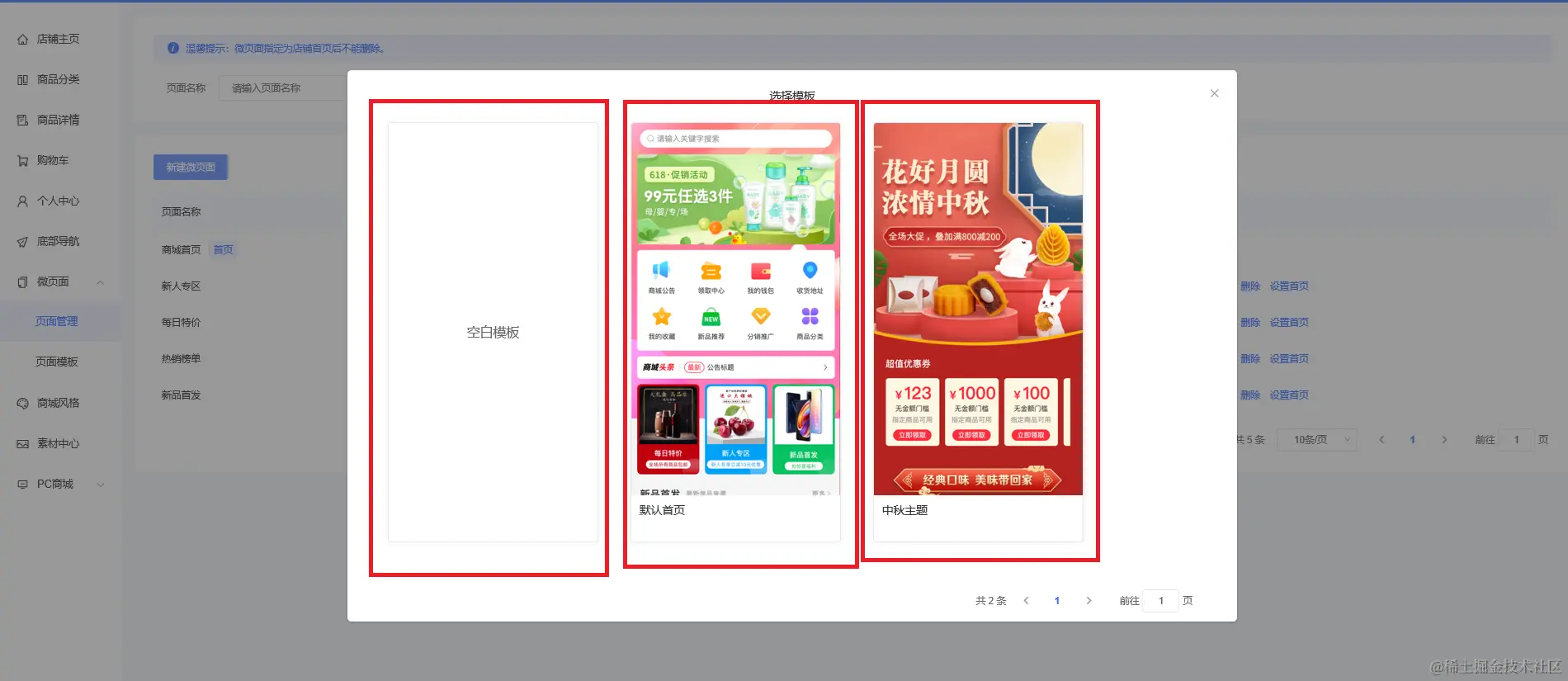 新建微页面有三种模板,空白模板、默认首页、中秋主题等,如下图所示: