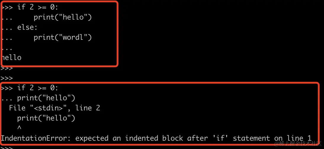 从上面的代码可以看出来,如果没有缩进,那么执行代码之后会有报错信息提示出来,