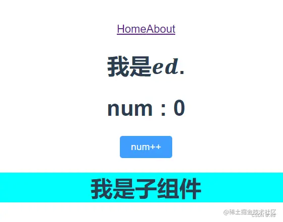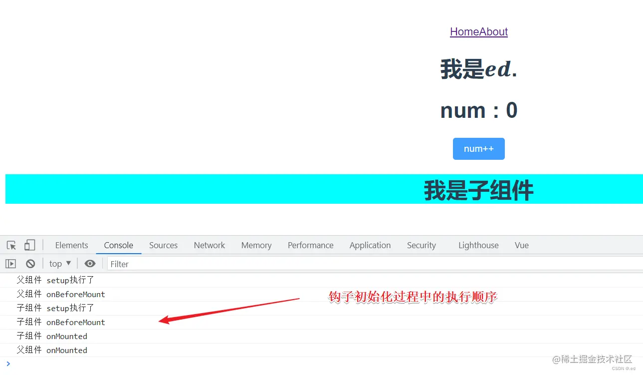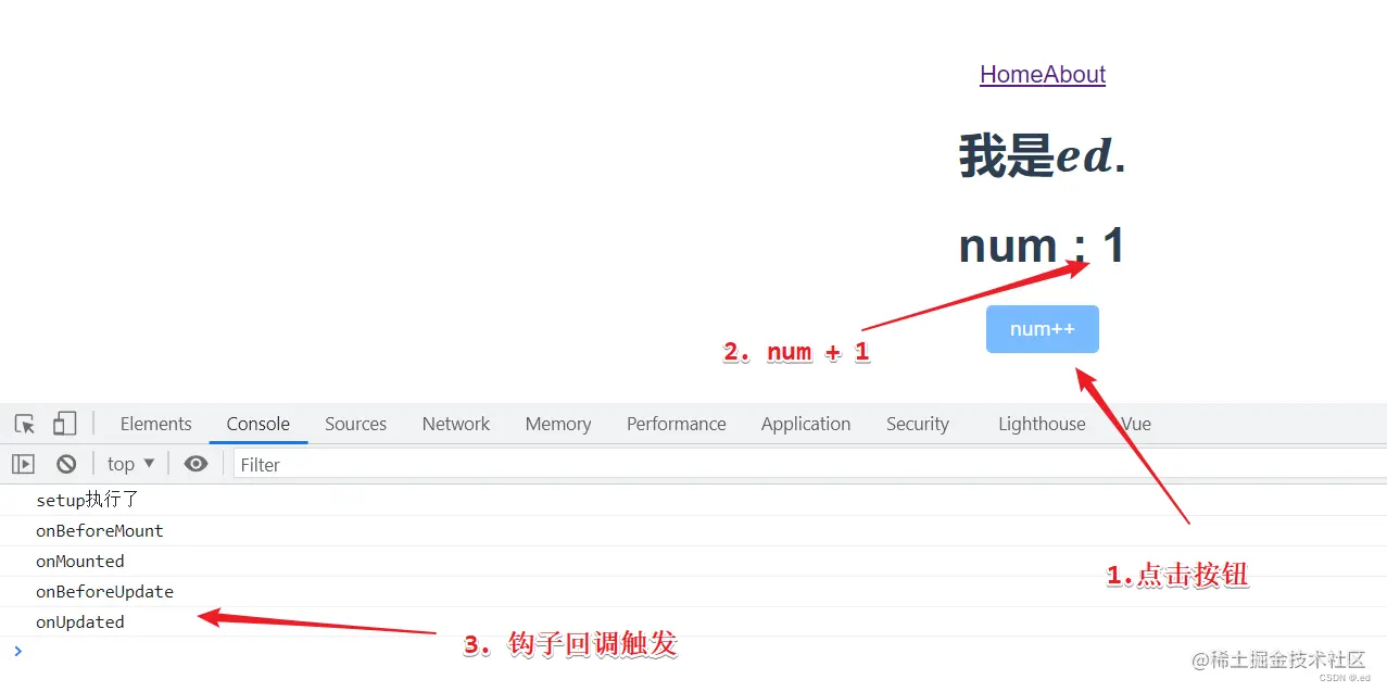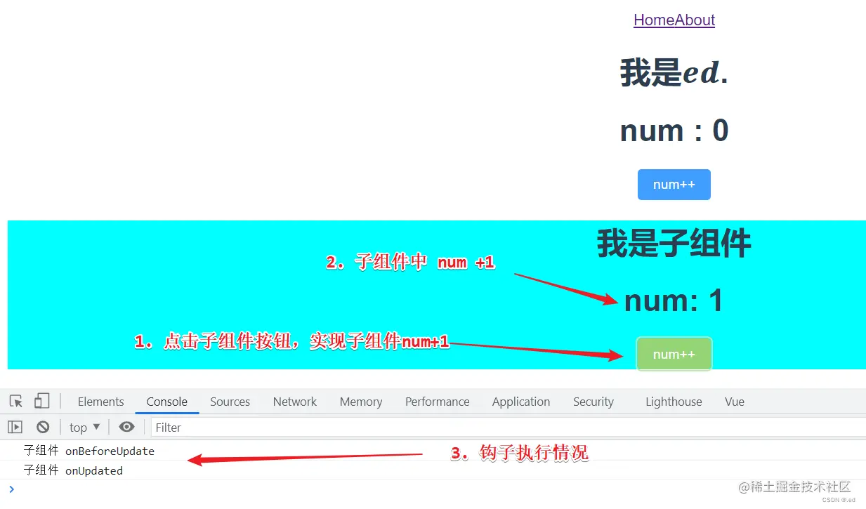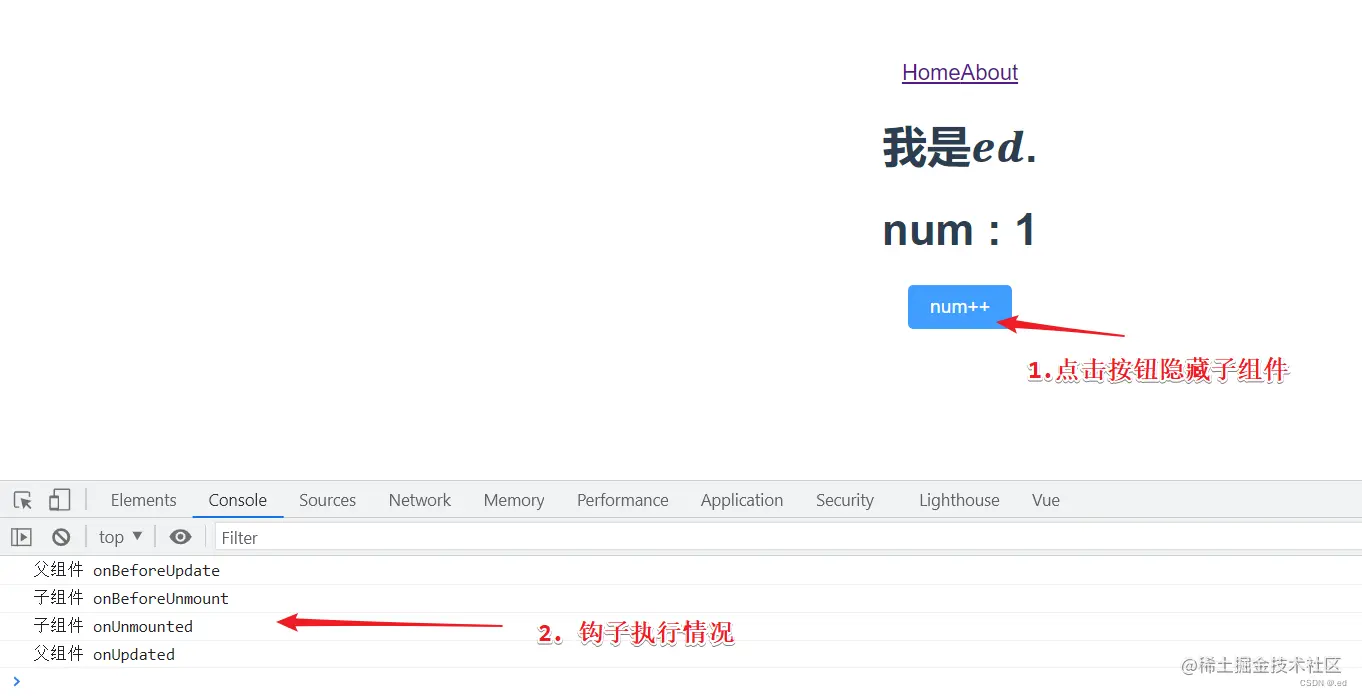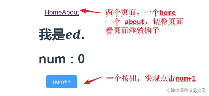 主要是有一个按钮,点击按钮的话 num 实现加 1 操作,可以清楚的看到页面数据更新后钩子的执行情况,然后有两个页面切换,可以看到页面注销时候钩子执行情况。
