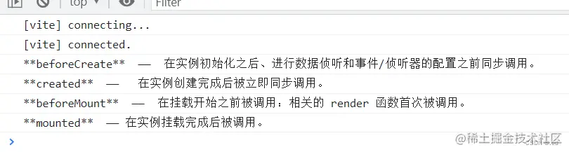 console.log('**beforeCreate** —— 在实例初始化之后、进行数据侦听和事件/侦听器的配置之前同步调用。')