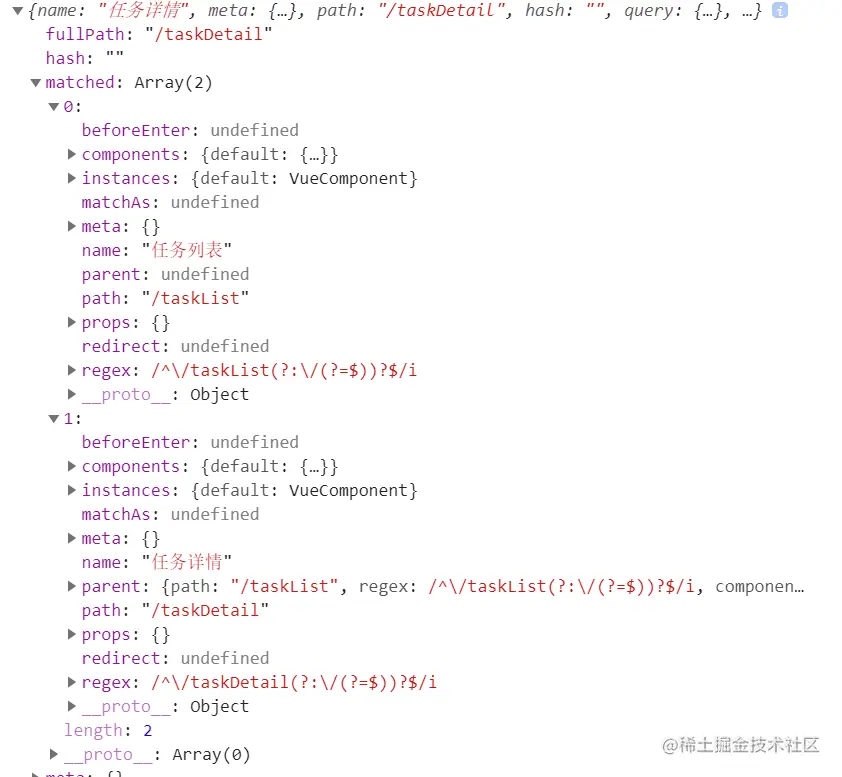 可以看到this.$route 显示了当前激活的路由的信息对象。这个对象是局部的,可以获取当前路由的 path, name, params, query 等属性,这里就不细说了。