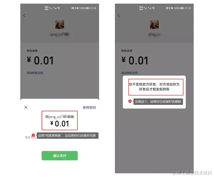 如果你想知道有没有被好友删除,不用再发消息验证。只需要打开转账,随便输入一个金额,出现“向某某转账”,这证明你们还是好兄弟,此时可以取消转账操作。如果出现的是“你不是收款方好友,对方添加你为好友才能发起转账”,这就说明你已经被该好友删除了。对方不会收到任何通知。
