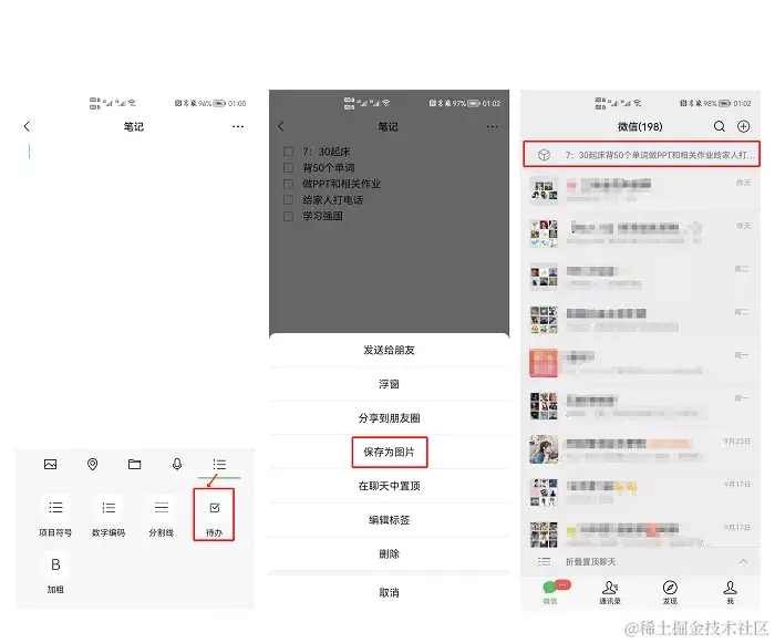 微信笔记除了拼接长图,还能设置待办事项。同样是在新建笔记中,点击右下角的“待办”,输入内容,再点击右上角的“在聊天中置顶”,之后打开微信,你就能随时看到它们。完成之后,你还能给完成的内容打勾。