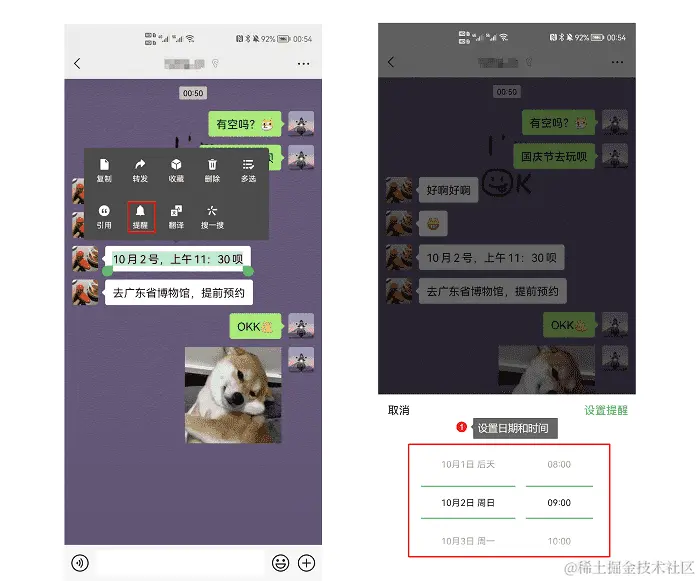 和朋友约好时间出去玩,怕错过时间?除了手机上设置时间提醒,微信也有这个功能。长按某个词条,就会弹出“提醒”,点击进去就会出现时间的设置,选择你要设置的日期以及时间。设置好后,日期时间一到,微信就会弹出词条来提醒你。